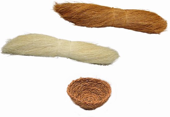 I provide both brown and bleached coconut fiber as nesting material. Once the first bits of nesting material appear inside the nest box, you can quickly see which color of the material the birds prefer. When a pair starts to build their nest, it is usually completely packed with material within a few days.