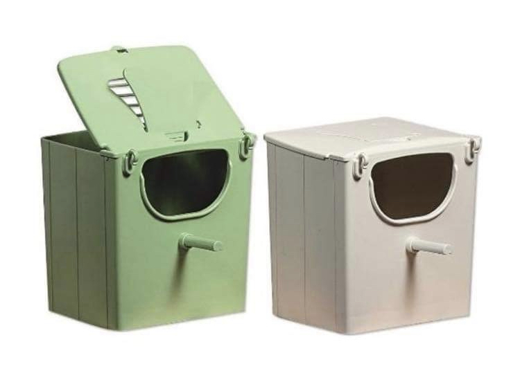 I use two different types of plastic nest boxes in various colors. Each pair of birds has its own preferences when it comes to the color and size of the nest box. I have deep nest boxes, which are preferred by almost all of my "nonnen" species. I have these in green and off-white. The other type is a simple plastic mail-slot style nest box in light brown or green. These are mostly used by the dwarf and brown-breasted finches.